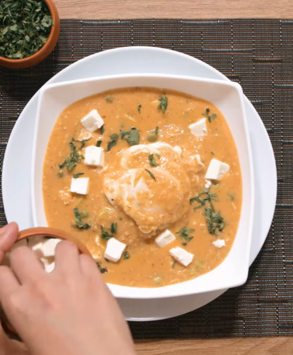 - Añadir los huevos uno a uno, el queso fresco y pimienta al gusto. Cocinar por 4 minutos, hasta que los huevos queden escalfados.