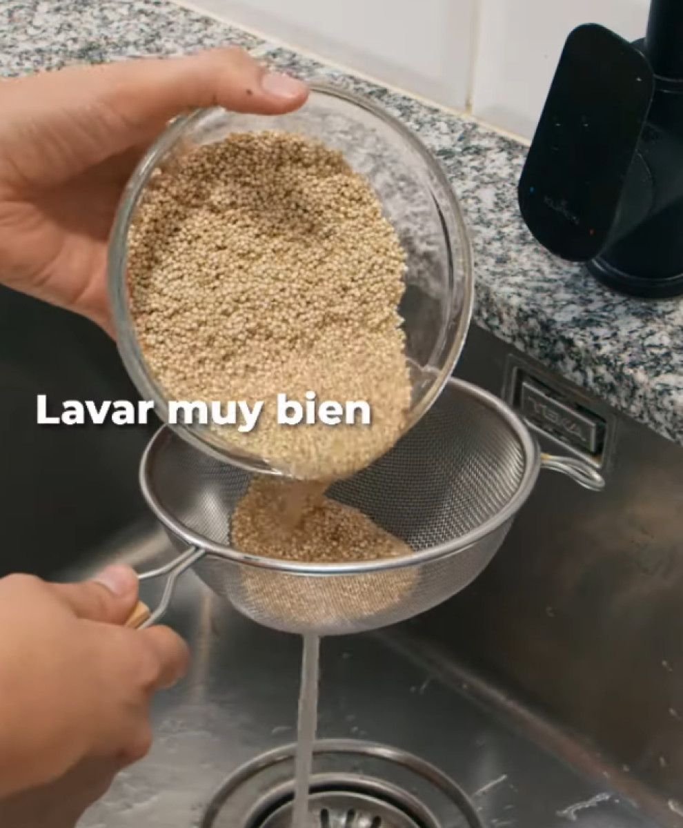- El remojo de la quinua ayudará a que reviente mejor y sea más vistosa. Además, es un buen complemento al lavado para evitar que la quinua quede amarga.