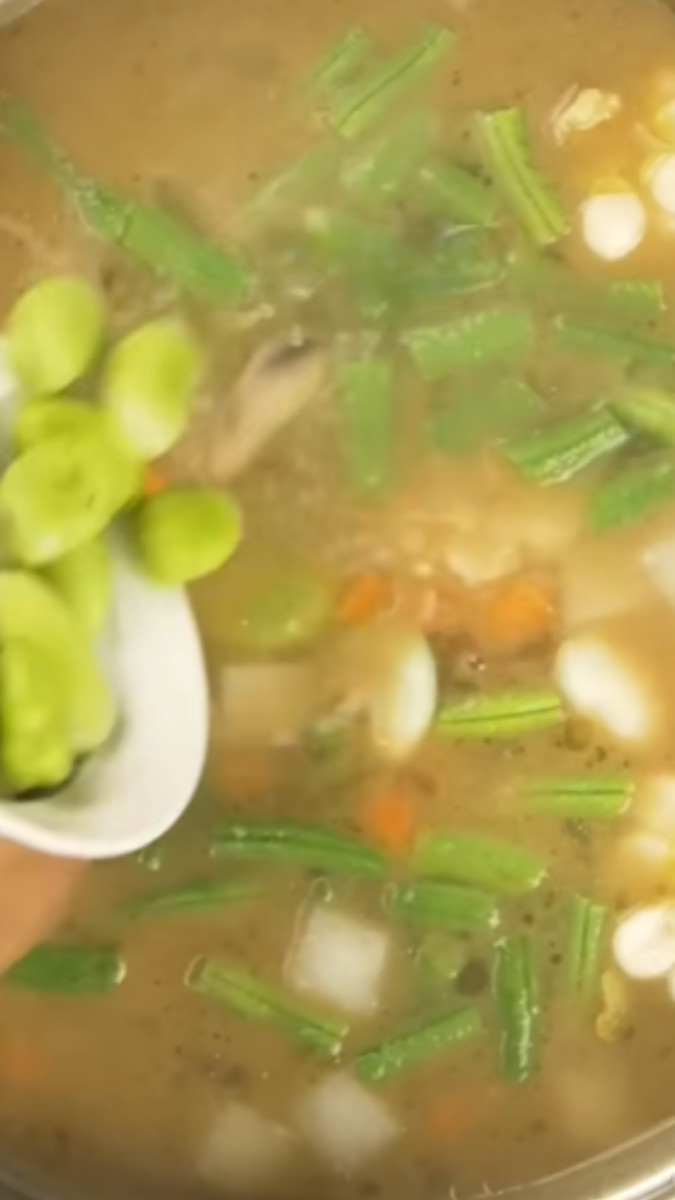 - Añadir la yuca, la papa, el nabo, el choclo, las arvejas, la zanahoria, los pallares, el frejol verde, las vainitas y las habas.Cocinar por 10 minutos.