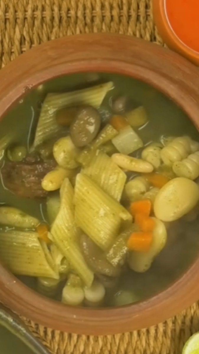 Y ese es otro detalle en la preparación: un buen caldo. Y en ese mismo caldo puedes empezar a agregar los ingredientes de nuestro menestrón: frejoles, nabo, zanahoria, choclo, vainitas, habas, zapallo… y en realidad, todo lo que gustes —en el orden y momento correcto para que no se sobre cocinen—, porque, al igual que nuestra cocina, el menestrón también le abre los brazos —o la olla— a lo que hay a la mano. Solo no olvides la pasta —canuto— que debe quedar al dente para que no termine perdida en el caldo.