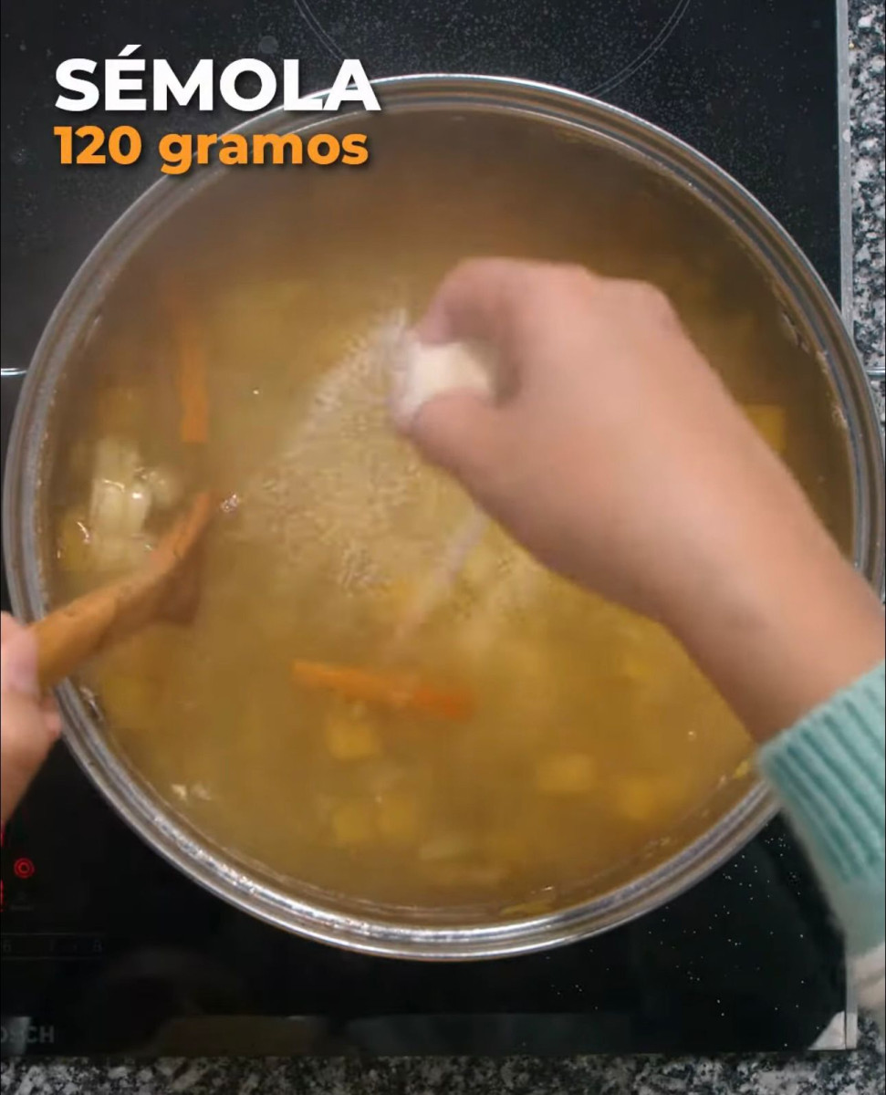 - Es muy importante añadir la sémola en forma de lluvia y sin dejar de mover, pues podrían formarse grumos.