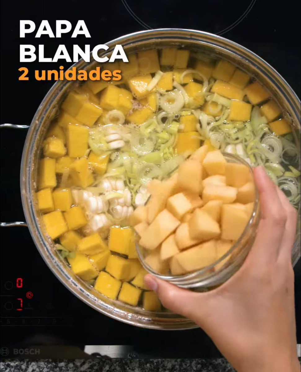 - Agregar las verduras: zapallo, apio, zanahoria, poro, choclo y papa blanca. Sazonar con sal. Cocinar por 20 minutos.